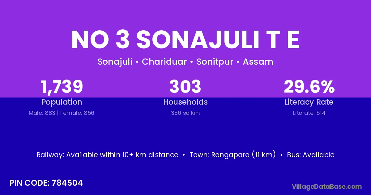 No 3 Sonajuli T E village has a total population of 1,739 people, of which 883 are males and 856 are females.