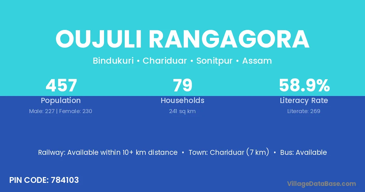 Chariduar (7 km) is the nearest town to Oujuli Rangagora village for major economic activities and is located approximately 7 km away.