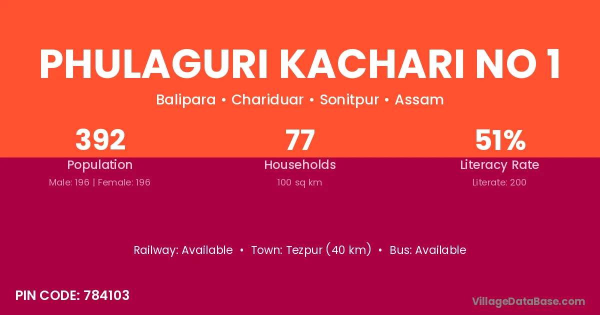 Phulaguri Kachari No 1 village has a total population of 392 people, of which 196 are males and 196 are females.
