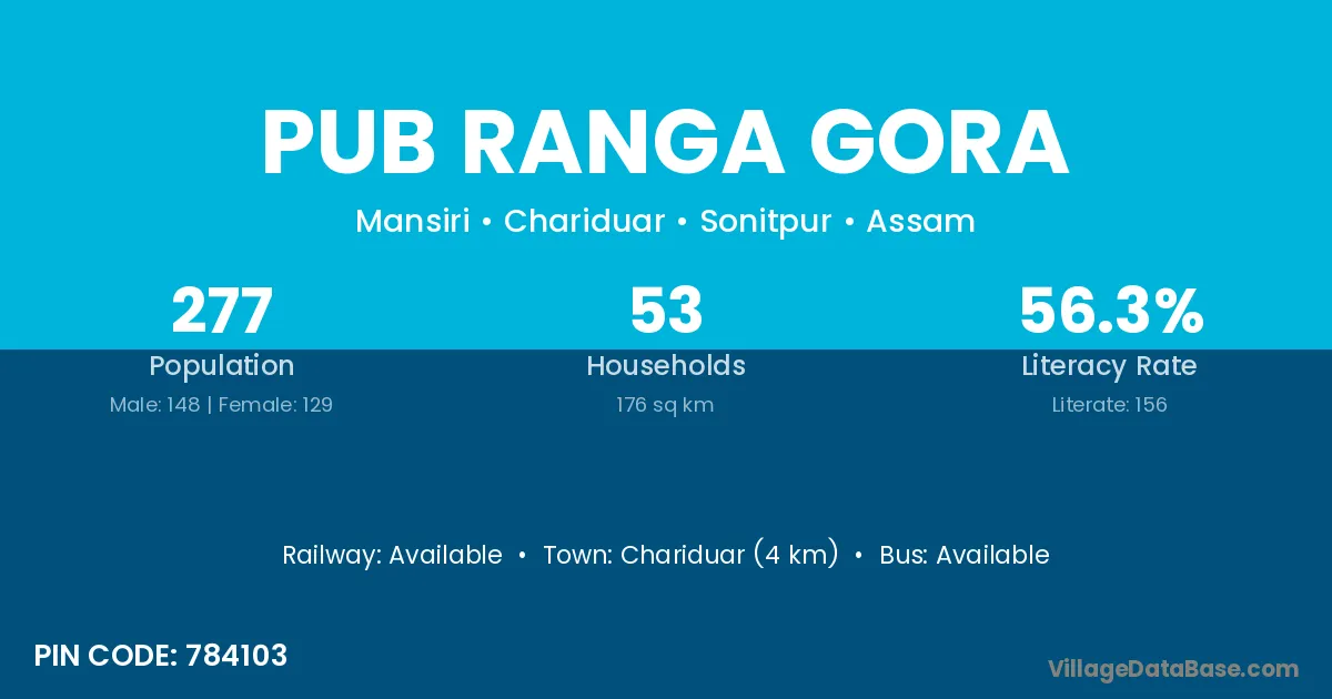 Chariduar (4 km) is the nearest town to Pub Ranga Gora village for major economic activities and is located approximately 4 km away.