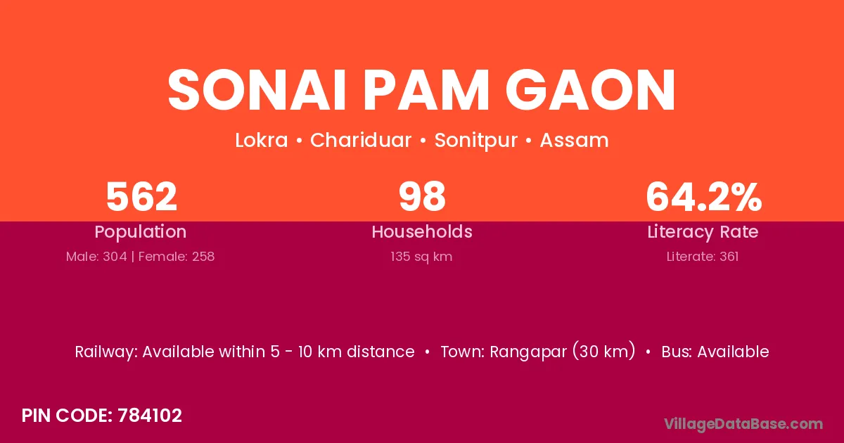 Rangapar (30 km) is the nearest town to Sonai Pam Gaon village for major economic activities and is located approximately 30 km away.