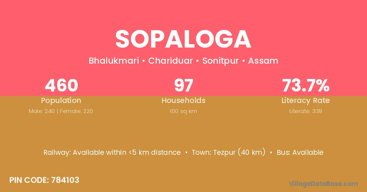 Tezpur (40 km) is the nearest town to Sopaloga village for major economic activities and is located approximately 40 km away.