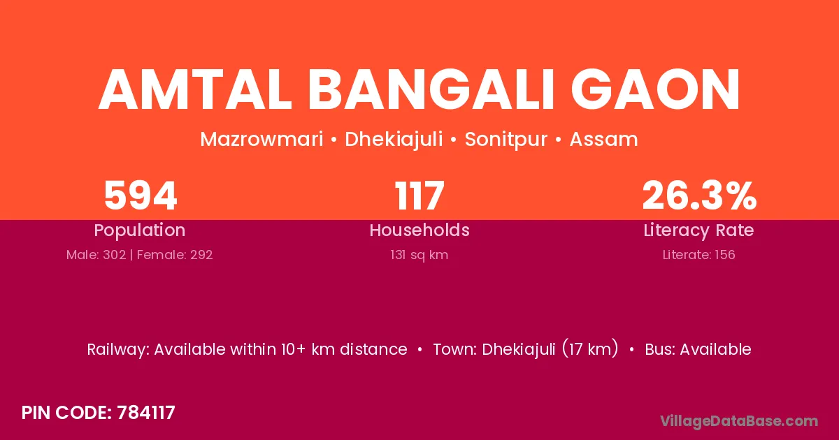 Amtal Bangali Gaon village has a total population of 594 people, of which 302 are males and 292 are females.