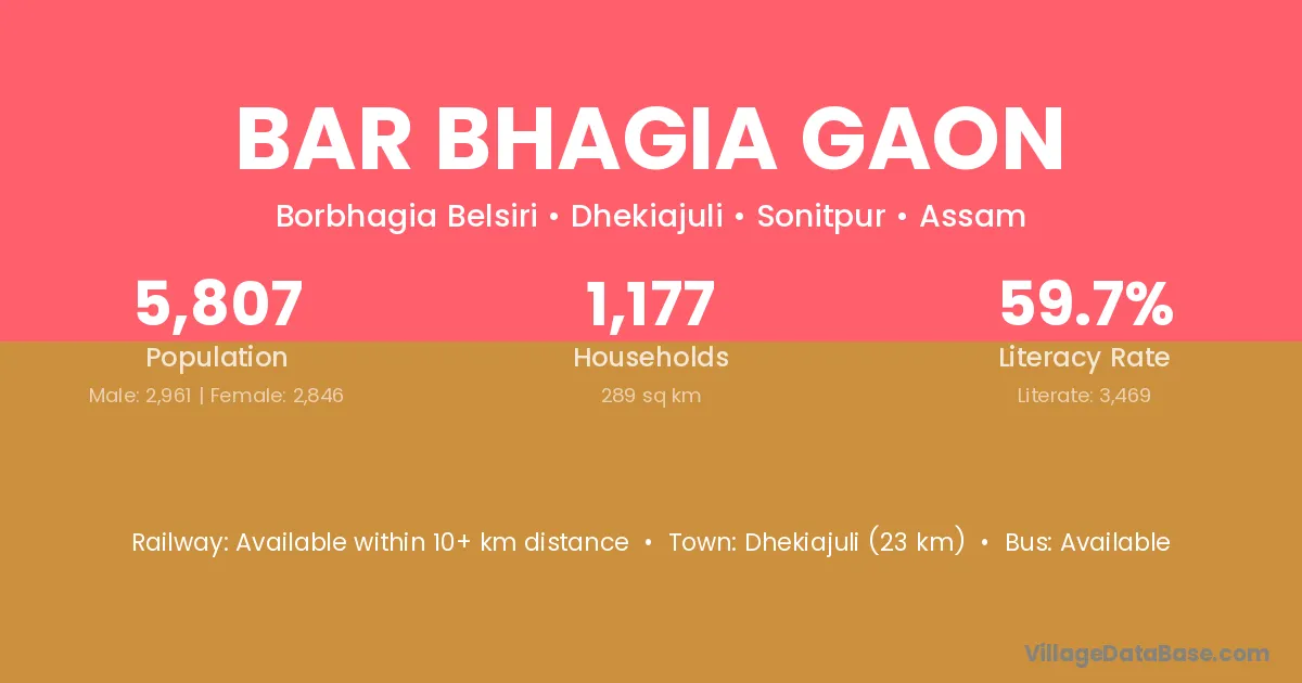 Dhekiajuli (23 km) is the nearest town to Bar Bhagia Gaon village for major economic activities and is located approximately 23 km away.