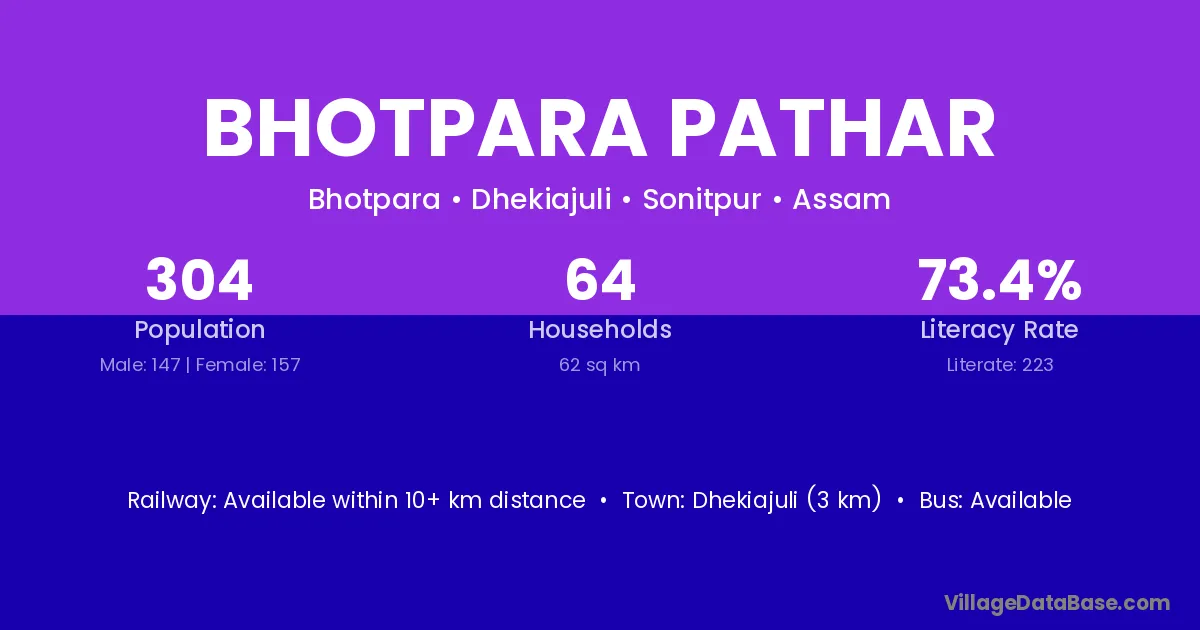 Dhekiajuli (3 km) is the nearest town to Bhotpara Pathar village for major economic activities and is located approximately 3 km away.