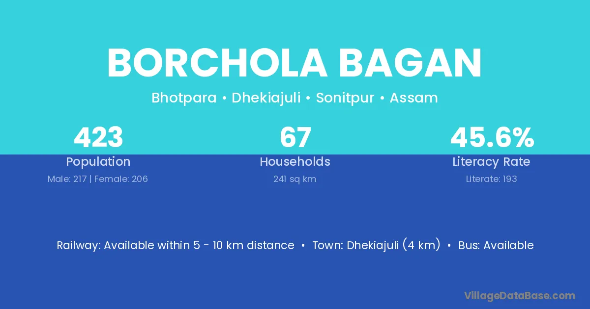 Dhekiajuli (4 km) is the nearest town to Borchola Bagan village for major economic activities and is located approximately 4 km away.