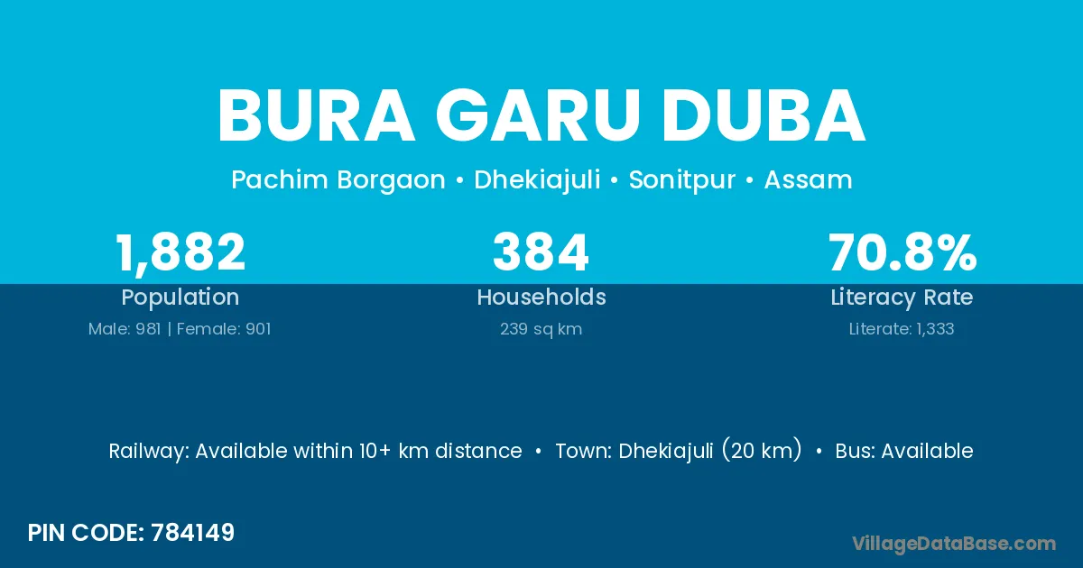 Dhekiajuli (20 km) is the nearest town to Bura Garu Duba village for major economic activities and is located approximately 20 km away.