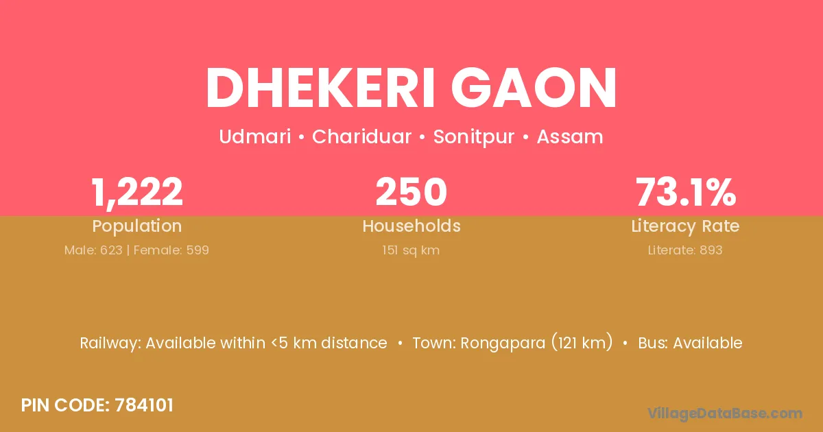 Dhekiajuli (19 km) is the nearest town to Dhekeri Gaon village for major economic activities and is located approximately 19 km away.