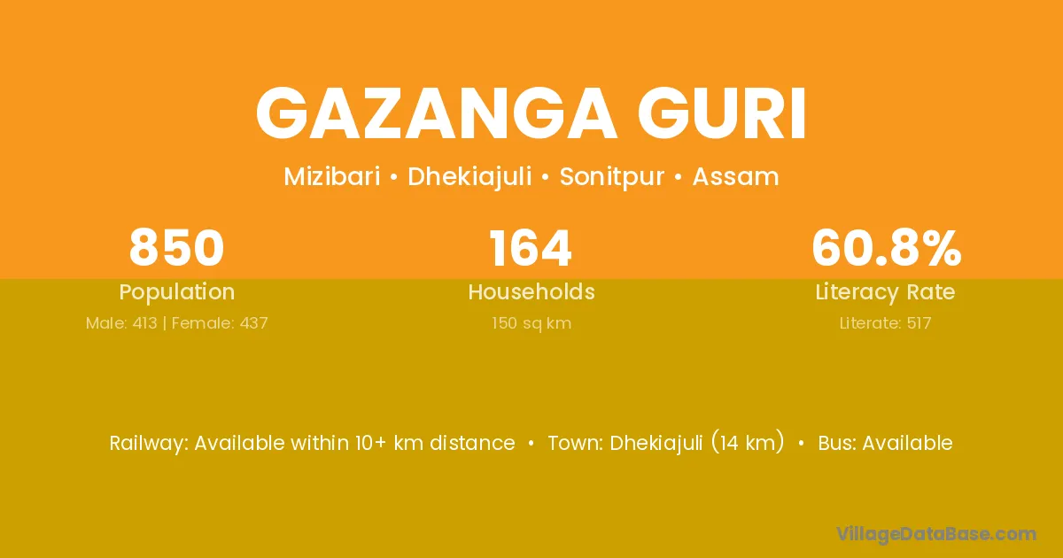 Dhekiajuli (14 km) is the nearest town to Gazanga Guri village for major economic activities and is located approximately 14 km away.