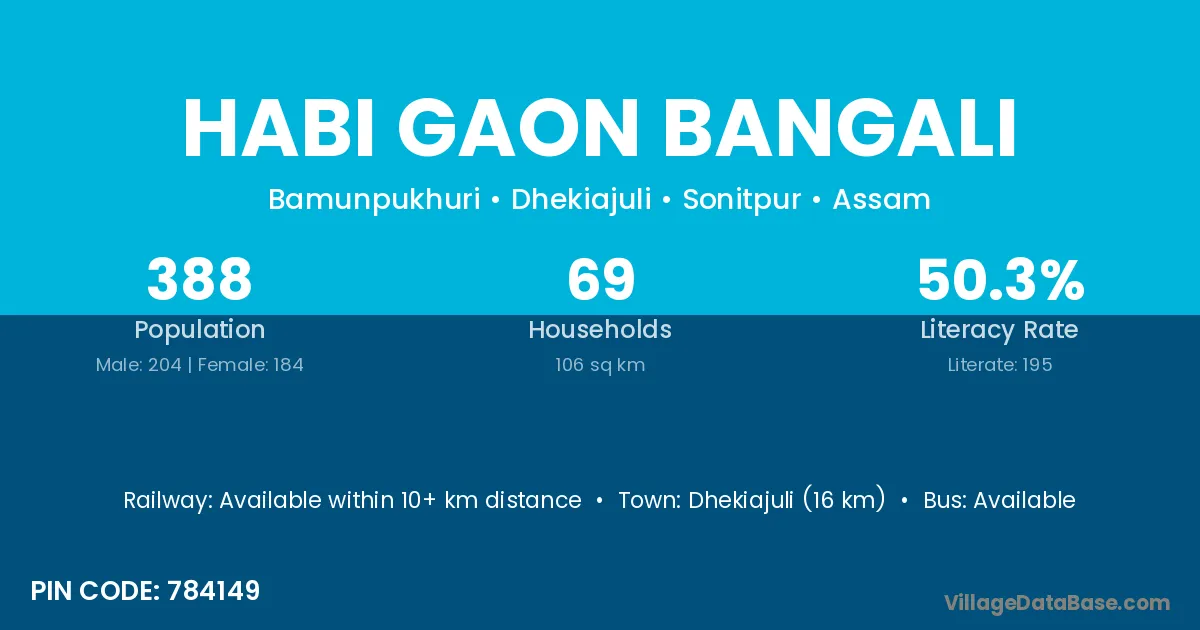 Dhekiajuli (16 km) is the nearest town to Habi Gaon Bangali village for major economic activities and is located approximately 16 km away.