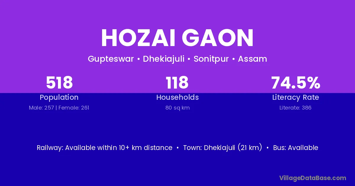 Dhekiajuli (21 km) is the nearest town to Hozai Gaon village for major economic activities and is located approximately 21 km away.