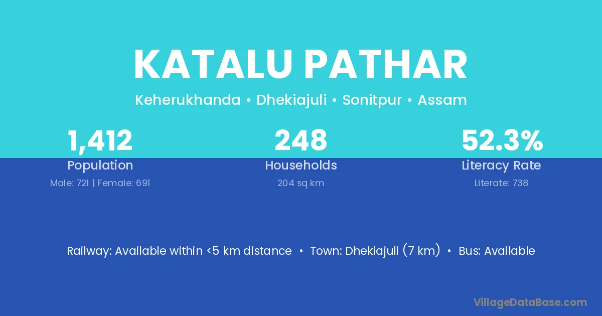 Dhekiajuli (7 km) is the nearest town to Katalu Pathar village for major economic activities and is located approximately 7 km away.
