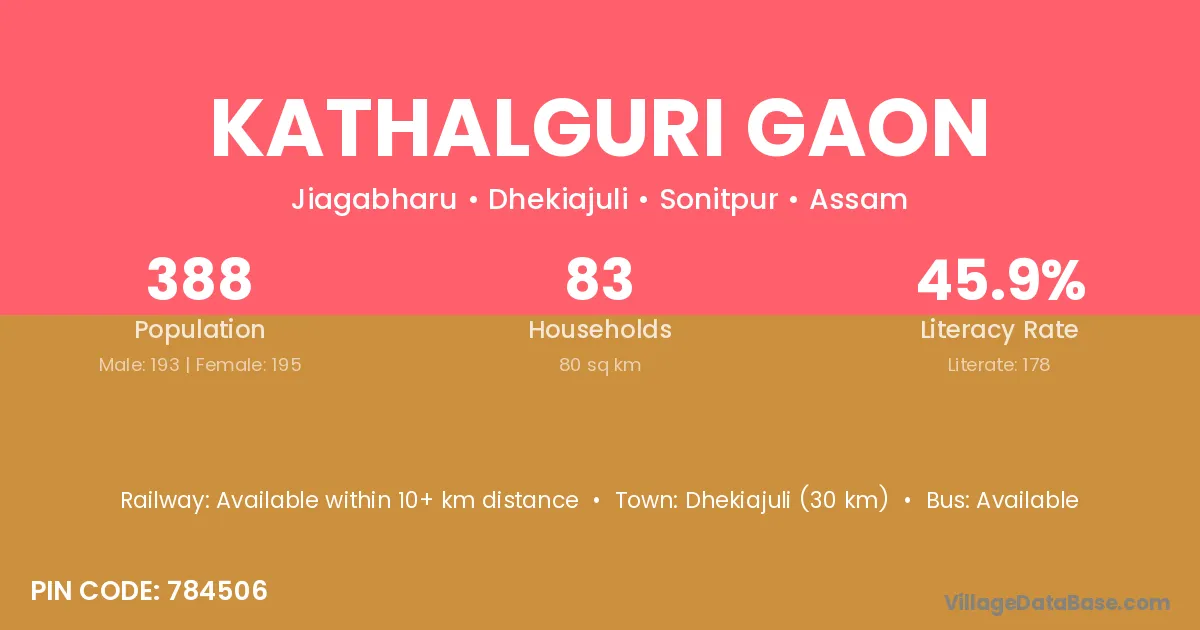 Kathalguri Gaon village has a total population of 388 people, of which 193 are males and 195 are females.