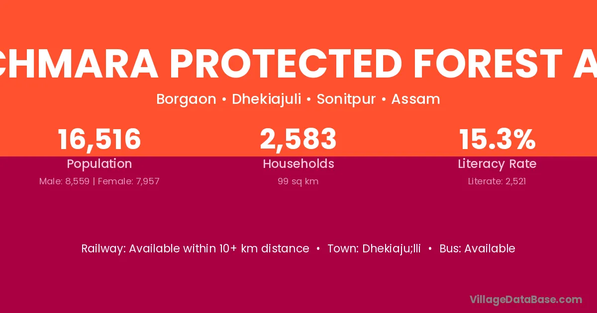 Kochmara Protected Forest Area village has a total population of 16,516 people, of which 8,559 are males and 7,957 are females.
