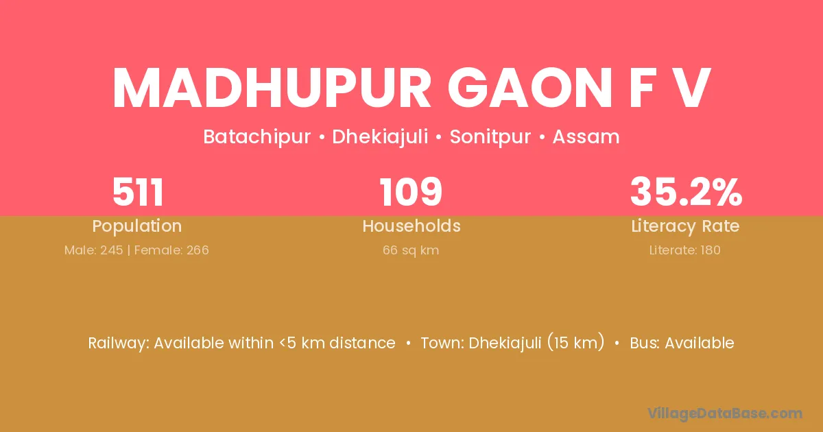Madhupur Gaon F V village has a total population of 511 people, of which 245 are males and 266 are females.