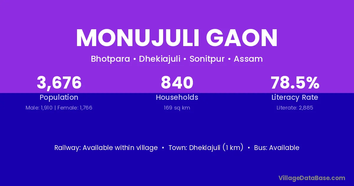 Dhekiajuli (1 km) is the nearest town to Monujuli Gaon village for major economic activities and is located approximately 1 km away.