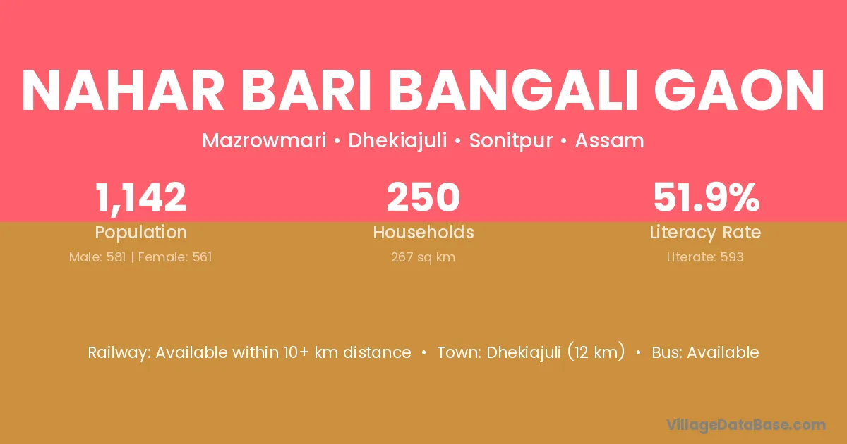 Nahar Bari Bangali Gaon village has a total population of 1,142 people, of which 581 are males and 561 are females.