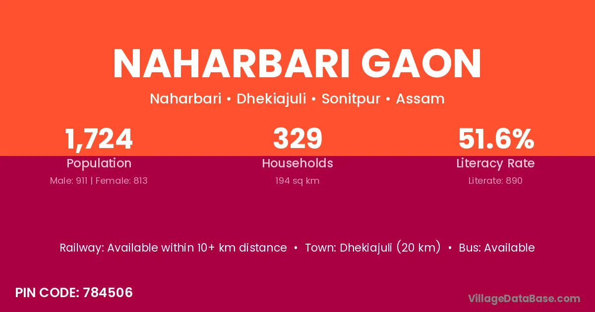 Dhekiajuli (20 km) is the nearest town to Naharbari Gaon village for major economic activities and is located approximately 20 km away.