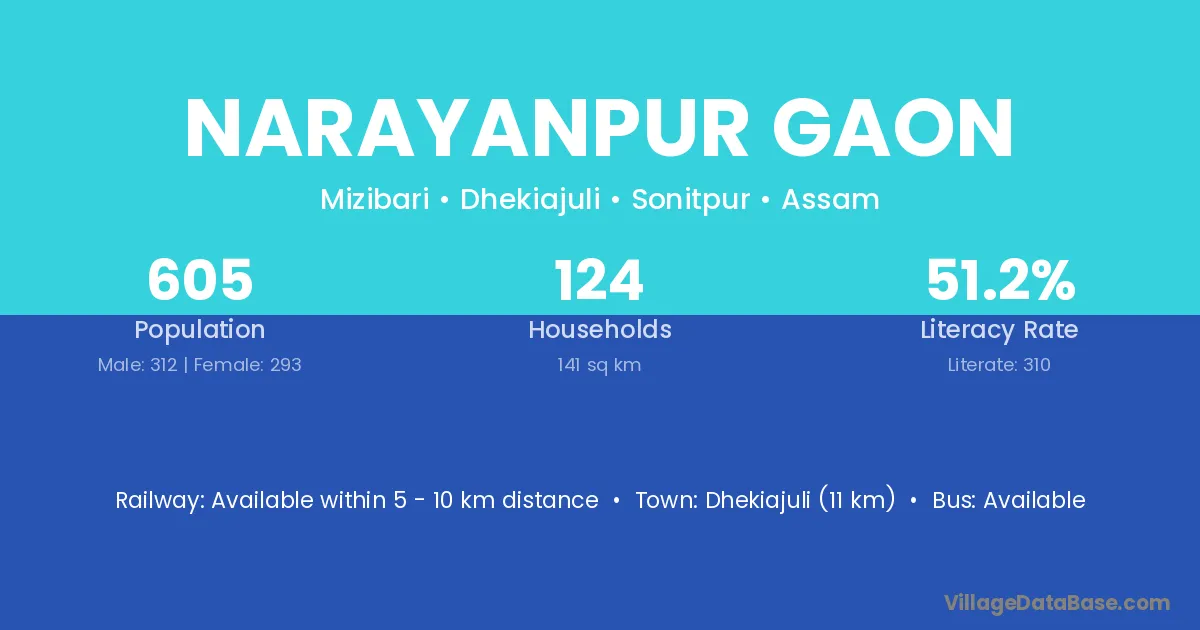 Narayanpur Gaon village has a total population of 605 people, of which 312 are males and 293 are females.