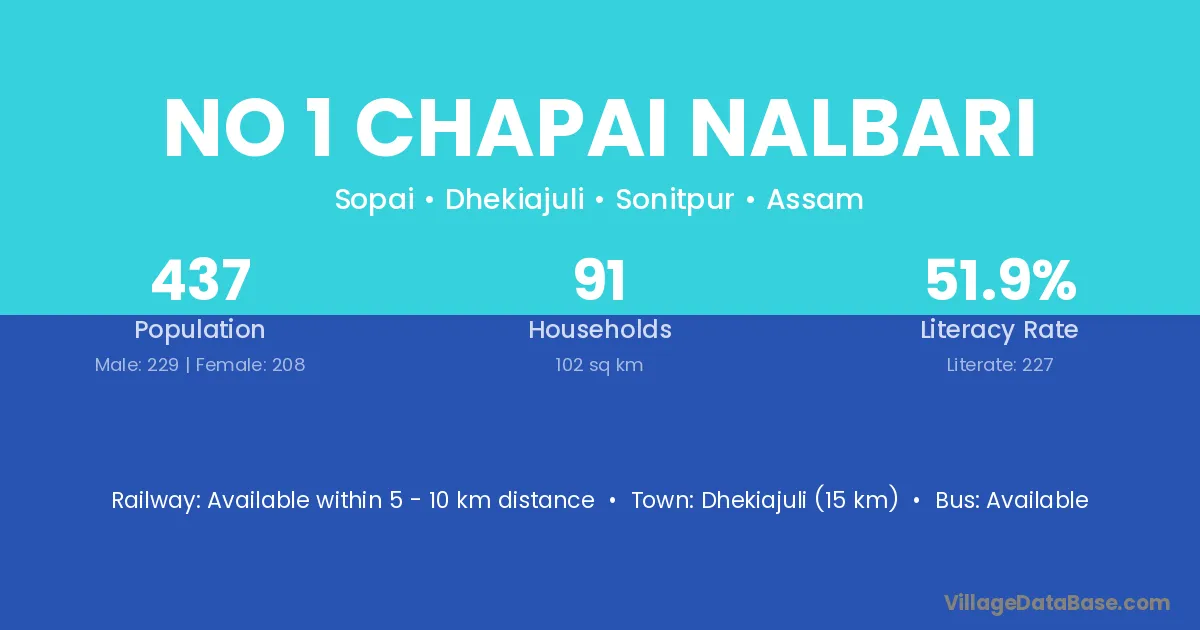 No 1 Chapai Nalbari village has a total population of 437 people, of which 229 are males and 208 are females.