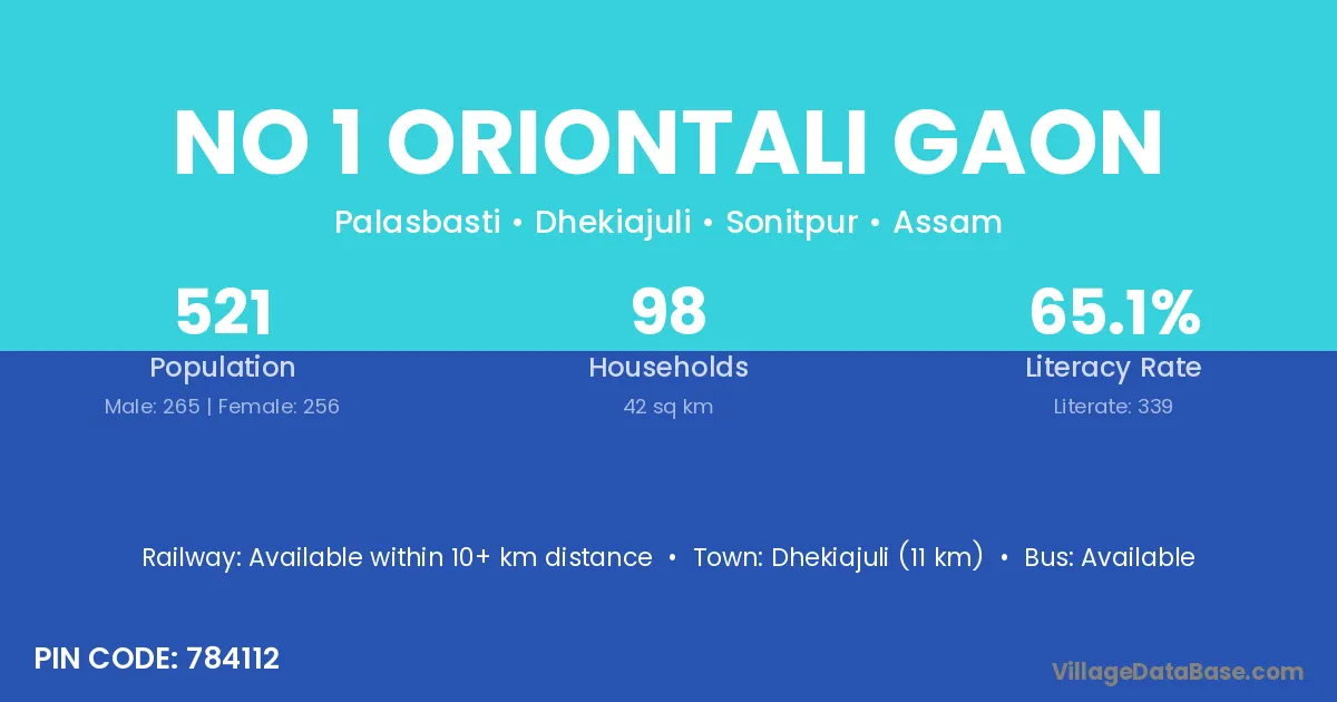 No 1 Oriontali Gaon village has a total population of 521 people, of which 265 are males and 256 are females.