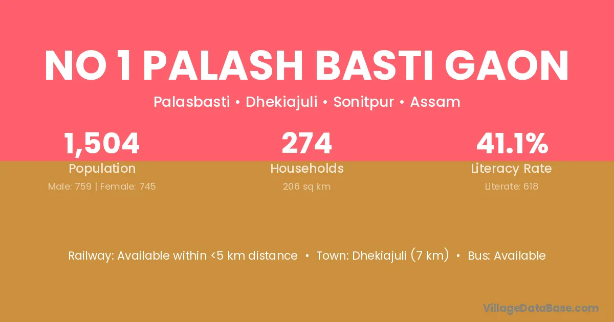 No 1 Palash Basti Gaon village has a total population of 1,504 people, of which 759 are males and 745 are females.
