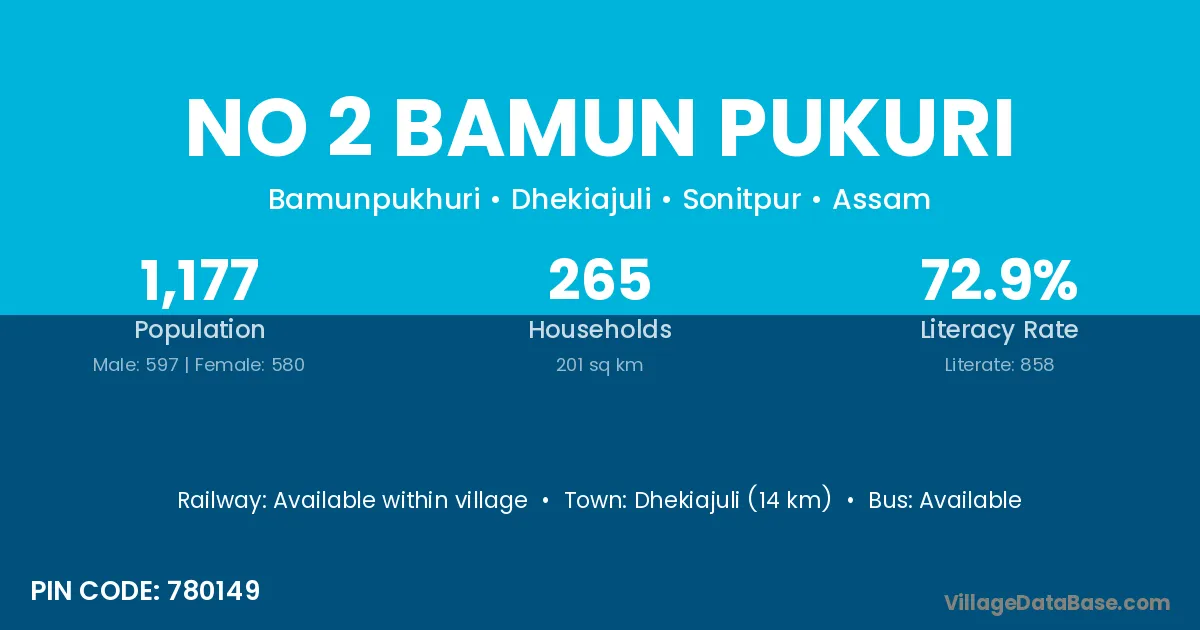 No 2 Bamun Pukuri village has a total population of 1,177 people, of which 597 are males and 580 are females.