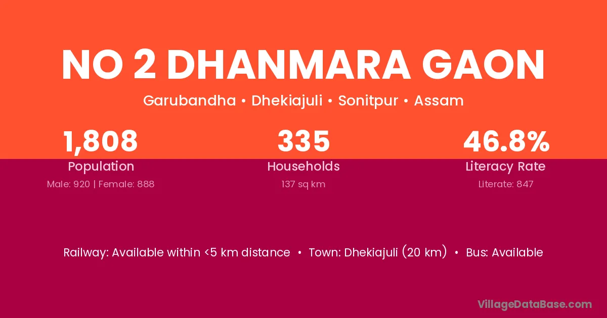 No 2 Dhanmara Gaon village has a total population of 1,808 people, of which 920 are males and 888 are females.