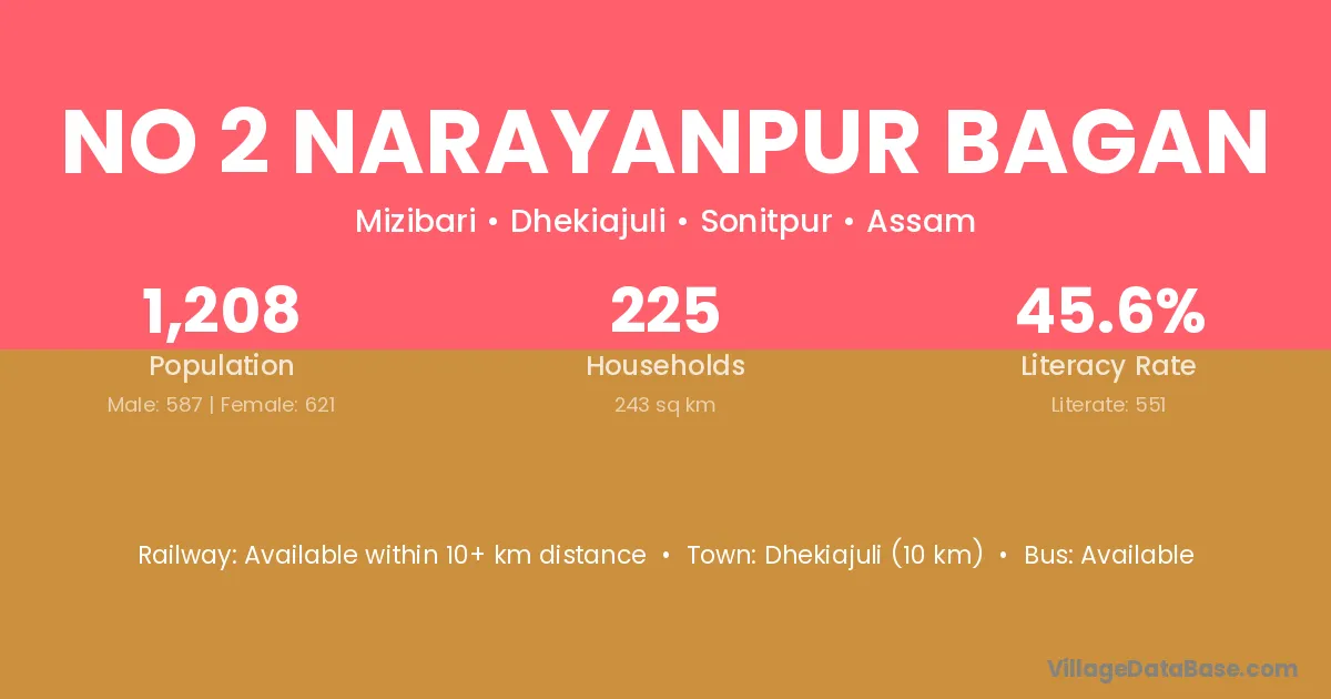 Dhekiajuli (10 km) is the nearest town to No 2 Narayanpur Bagan village for major economic activities and is located approximately 10 km away.