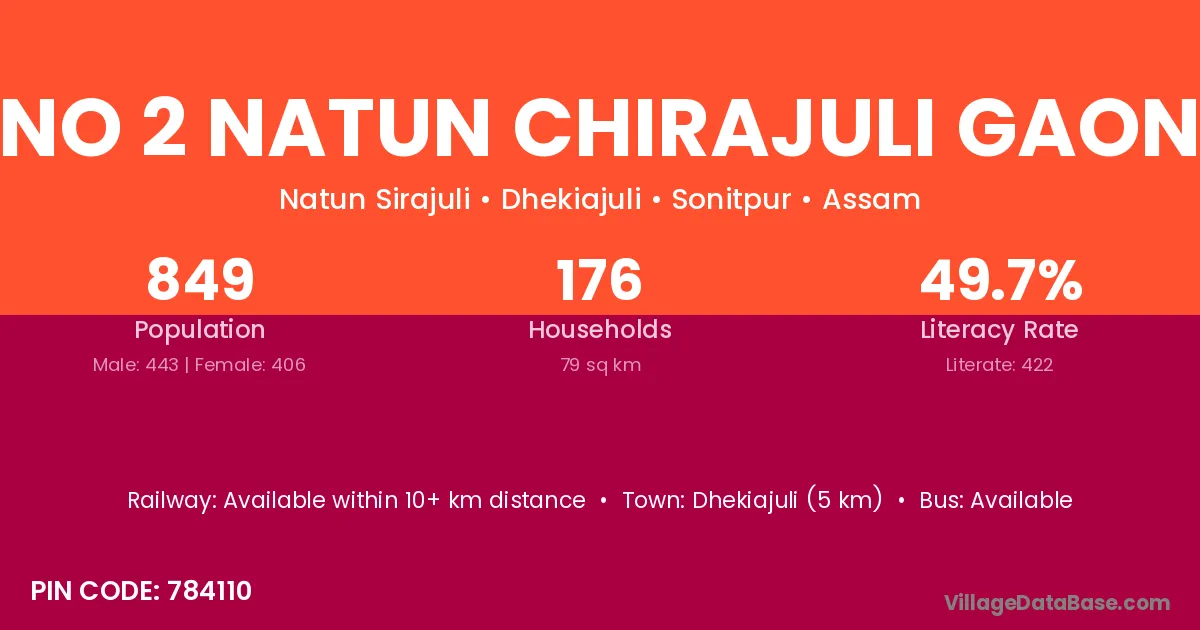 No 2 Natun Chirajuli Gaon village has a total population of 849 people, of which 443 are males and 406 are females.