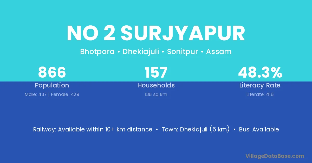 No 2 Surjyapur village has a total population of 866 people, of which 437 are males and 429 are females.