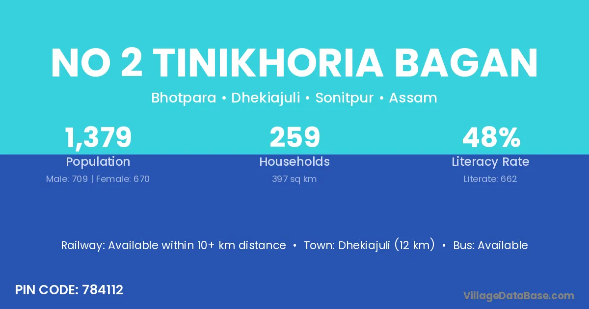 Dhekiajuli (12 km) is the nearest town to No 2 Tinikhoria Bagan village for major economic activities and is located approximately 12 km away.