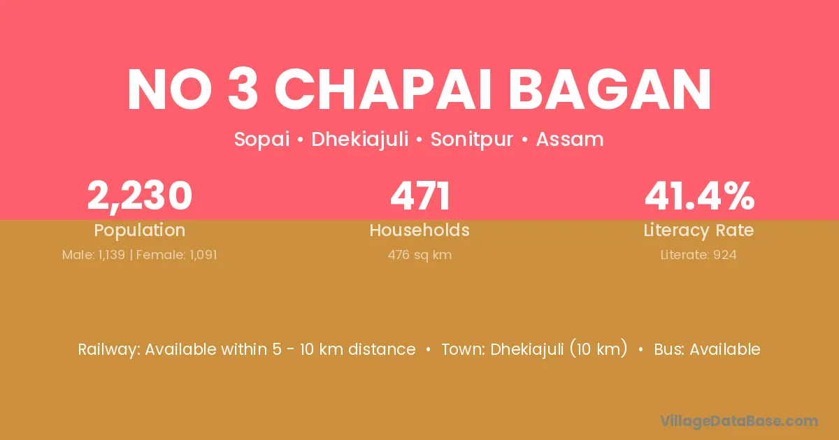 Dhekiajuli (10 km) is the nearest town to No 3 Chapai Bagan village for major economic activities and is located approximately 10 km away.