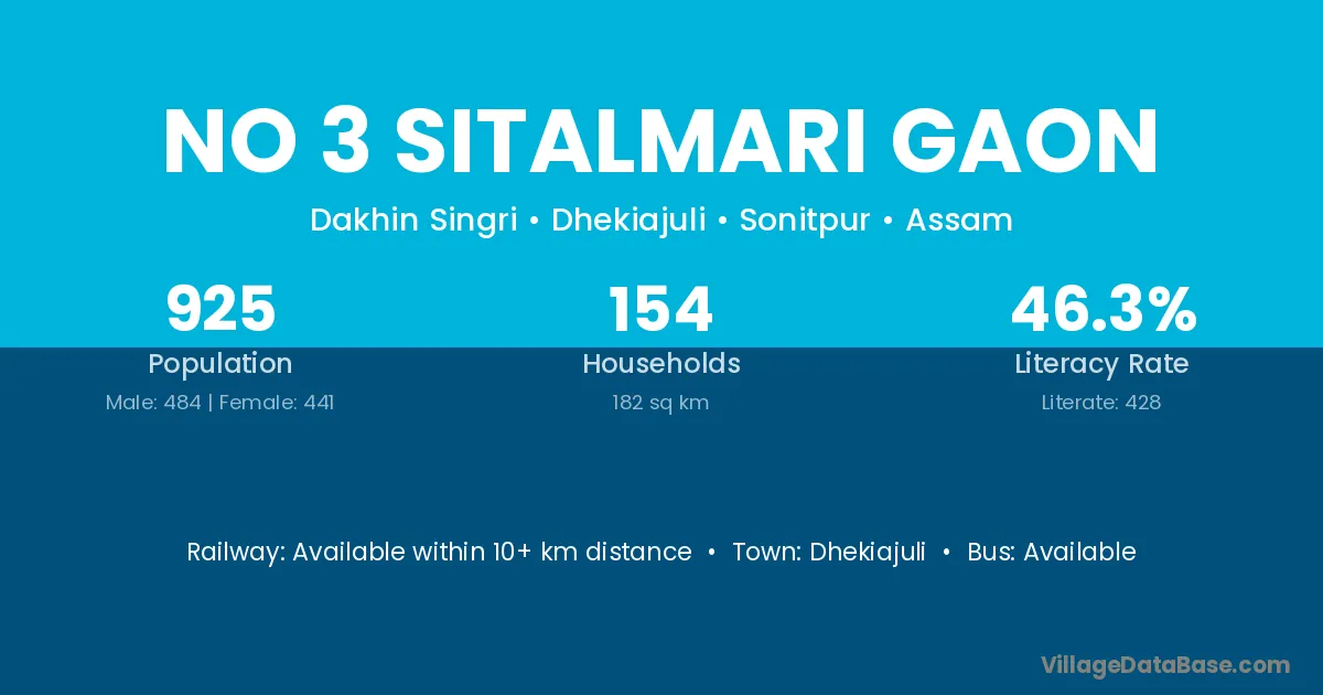 No 3 Sitalmari Gaon village has a total population of 925 people, of which 484 are males and 441 are females.