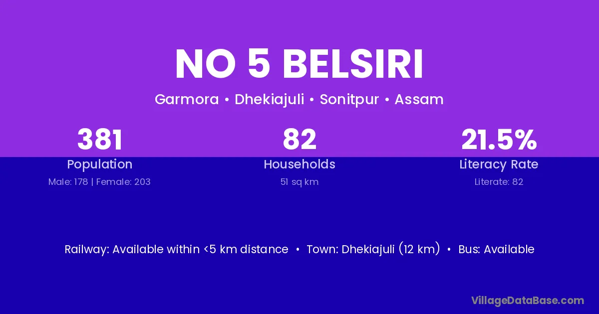 Dhekiajuli (12 km) is the nearest town to No 5 Belsiri village for major economic activities and is located approximately 12 km away.