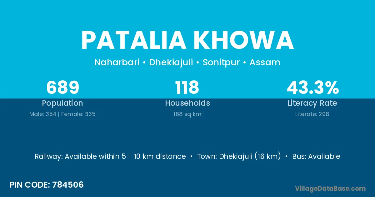 Dhekiajuli (16 km) is the nearest town to Patalia Khowa village for major economic activities and is located approximately 16 km away.