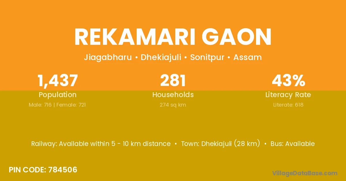 Dhekiajuli (28 km) is the nearest town to Rekamari Gaon village for major economic activities and is located approximately 28 km away.