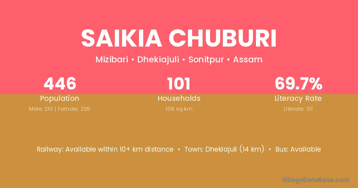 Saikia Chuburi village has a total population of 446 people, of which 210 are males and 236 are females.
