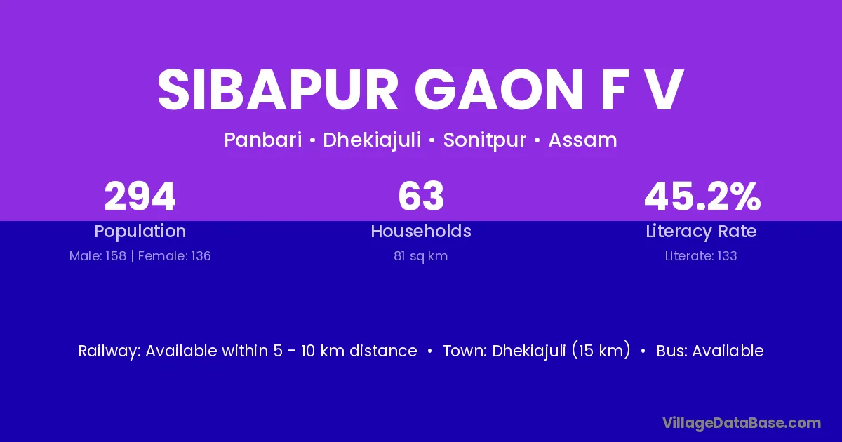 Dhekiajuli (15 km) is the nearest town to Sibapur Gaon F V village for major economic activities and is located approximately 15 km away.