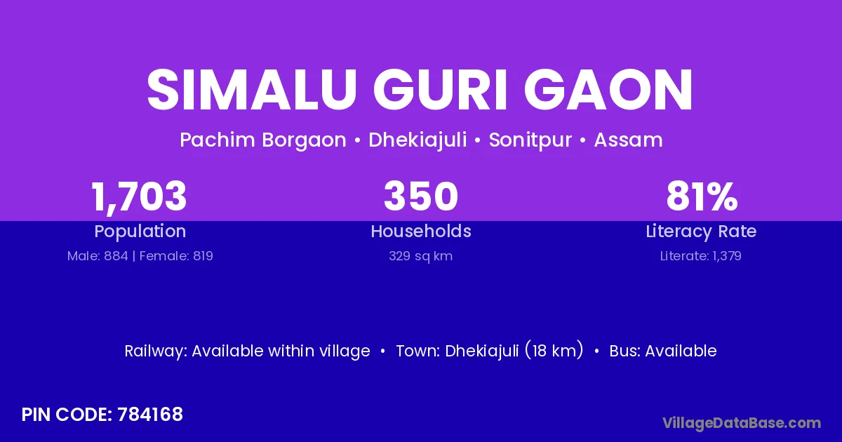 Dhekiajuli (18 km) is the nearest town to Simalu Guri Gaon village for major economic activities and is located approximately 18 km away.