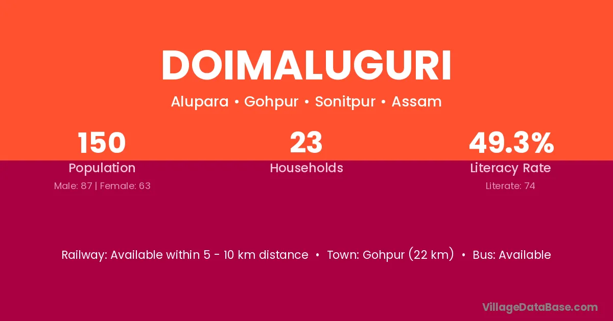 Doimaluguri village has a total population of 150 people, of which 87 are males and 63 are females.