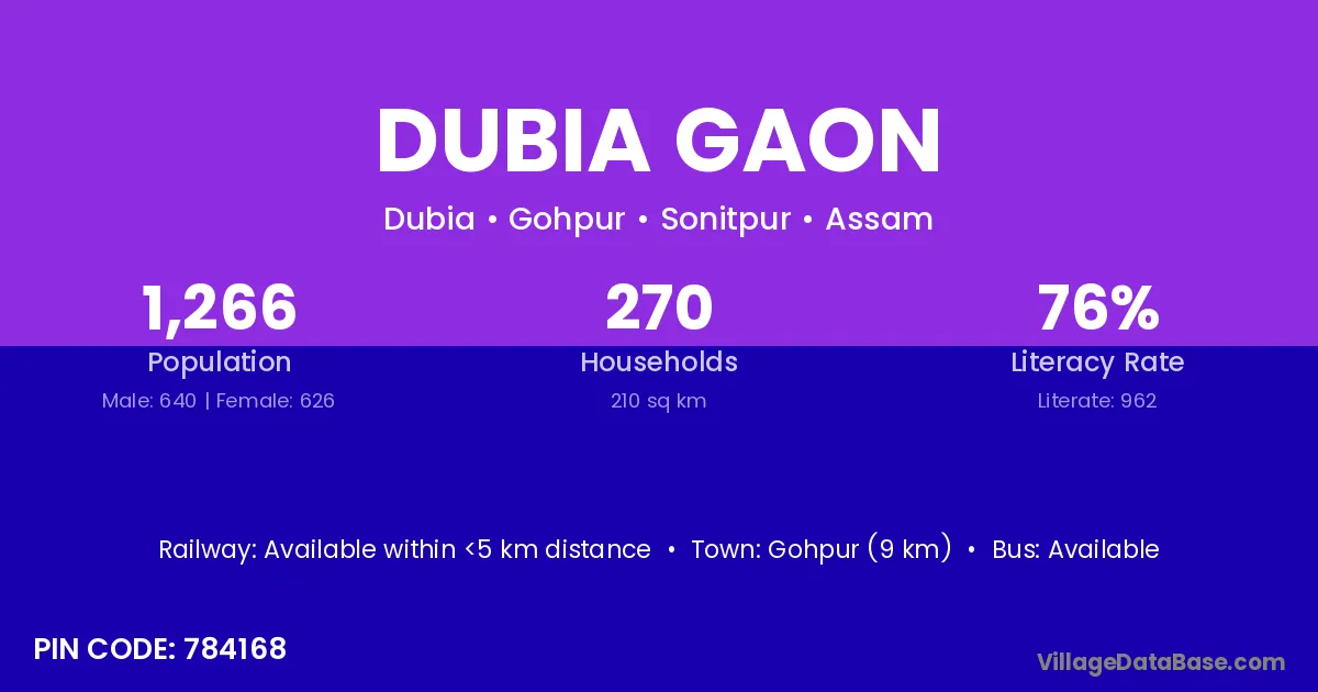 Dubia Gaon village has a total population of 1,266 people, of which 640 are males and 626 are females.