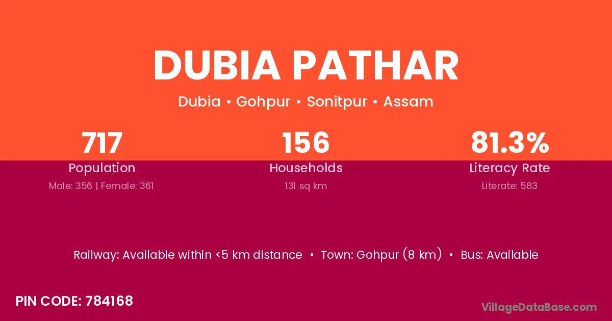 Gohpur (8 km) is the nearest town to Dubia Pathar village for major economic activities and is located approximately 8 km away.