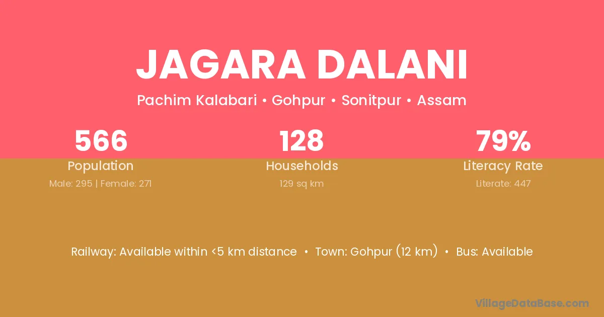 Gohpur (12 km) is the nearest town to Jagara Dalani village for major economic activities and is located approximately 12 km away.