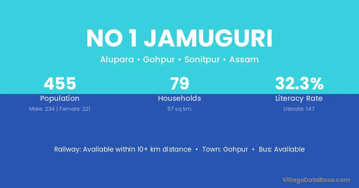 No 1 Jamuguri village has a total population of 455 people, of which 234 are males and 221 are females.