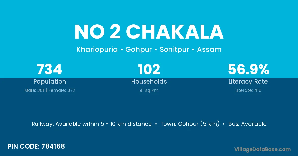Gohpur (5 km) is the nearest town to No 2 Chakala village for major economic activities and is located approximately 5 km away.
