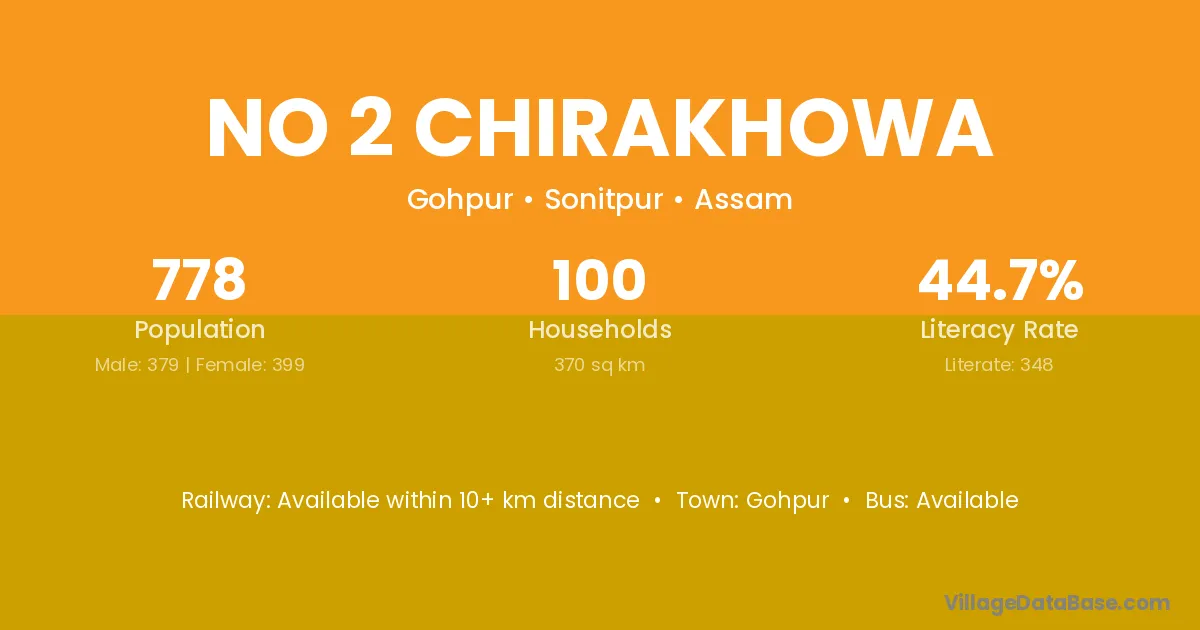 No 2 Chirakhowa village has a total population of 778 people, of which 379 are males and 399 are females.
