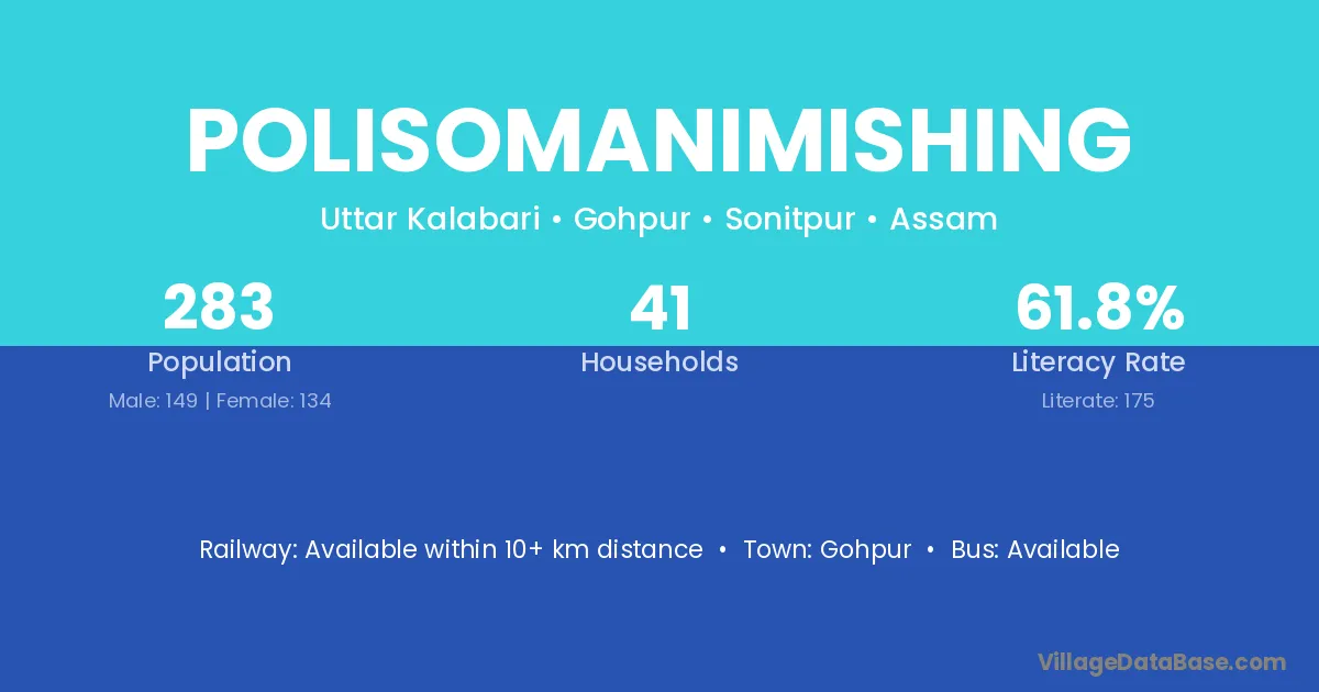 The literacy rate of Polisomanimishing village is 61.84%. Male literacy stands at 67.79% and female literacy at 55.22%.