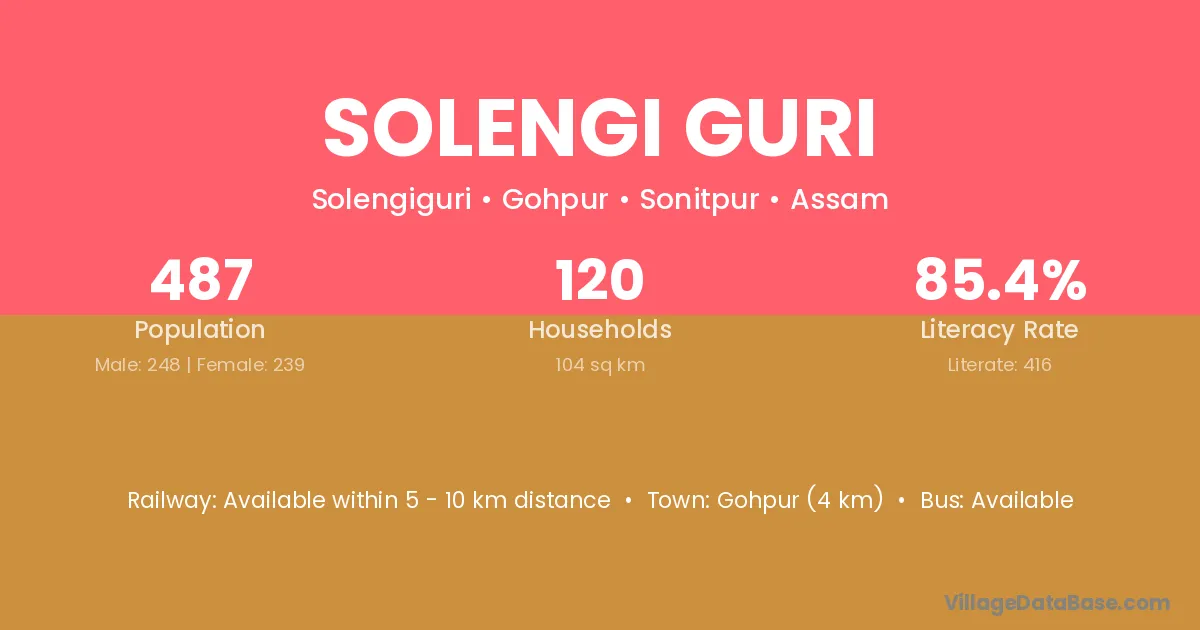 Gohpur (4 km) is the nearest town to Solengi Guri village for major economic activities and is located approximately 4 km away.