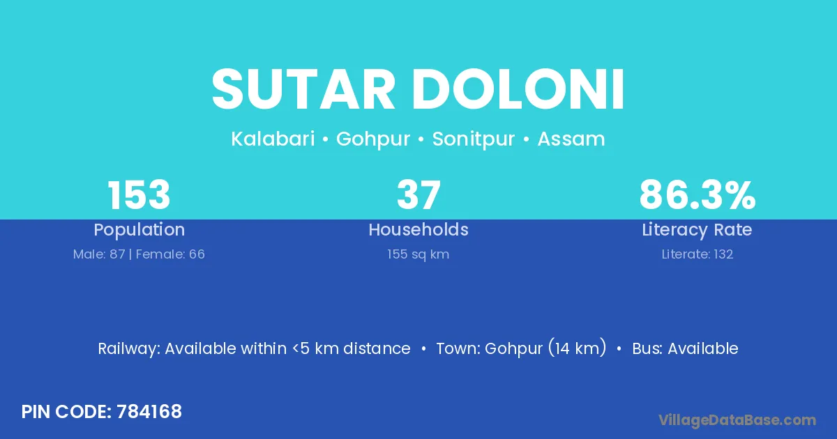 Gohpur (14 km) is the nearest town to Sutar Doloni village for major economic activities and is located approximately 14 km away.